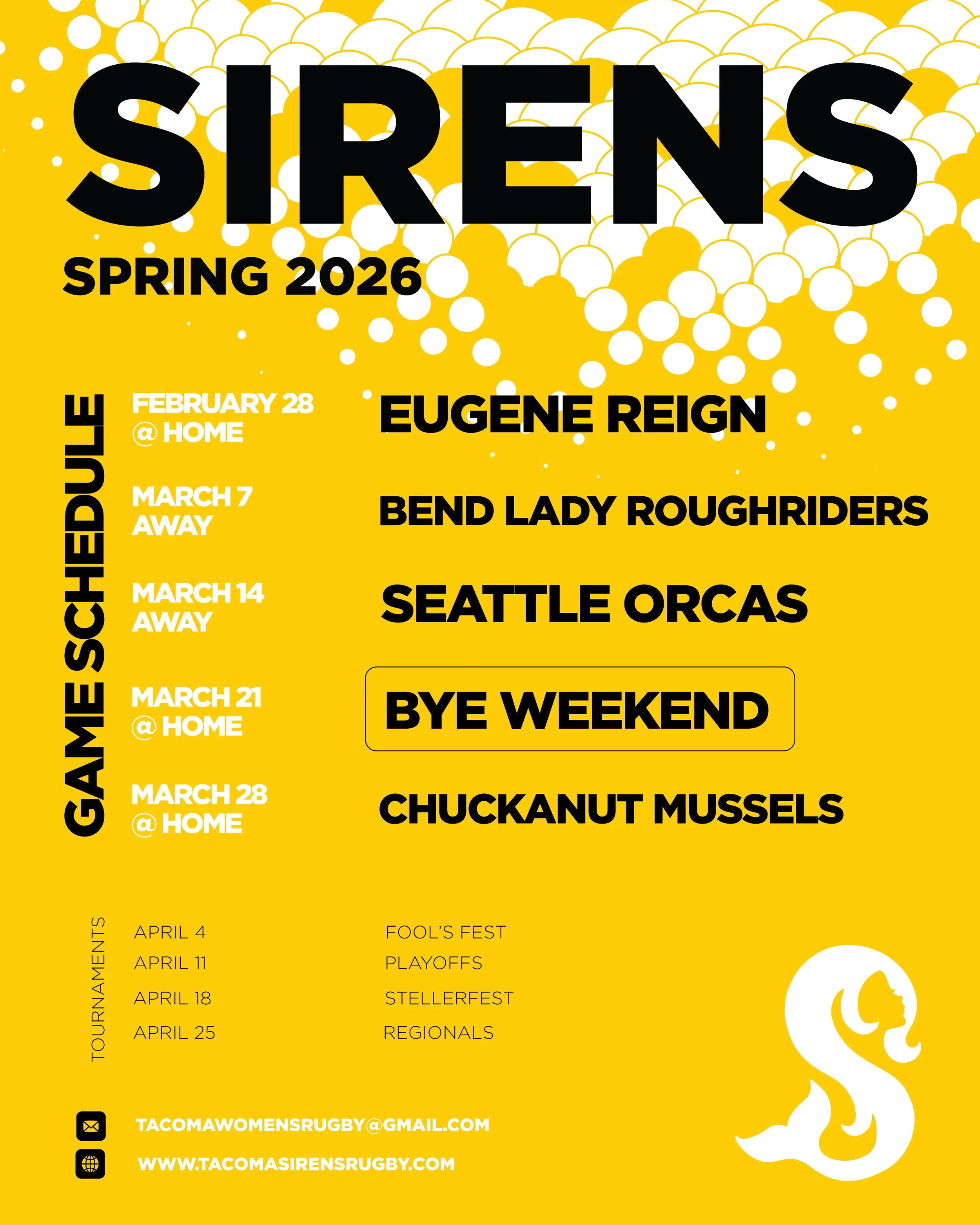 SCHEDULE 2026 Spring PRACTICe TUESDAYS & THURSDAYS 6:30PM-8:30PMPORTLAND AVENUE PARK3515 PORTLAND AVE E, 98404begins January 27, 2026 ——-DO YOU WANT TO BE A SIREN? TO STAY UP TO DATE ON PRACTICES, GAMES, SOCIALS, & CLUB COMMUNICATIONS, REGISTER WITH THE TEAM BELOW.STACK SPORTS@tacomasirensrugby on instagram